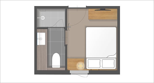 12㎡ながら、幅1,400mmのダブルベッド、オーバーヘッドシャワー付のシャワーブース、独立したトイレ、使い勝手の良い洗面台を機能的に配した客室です。