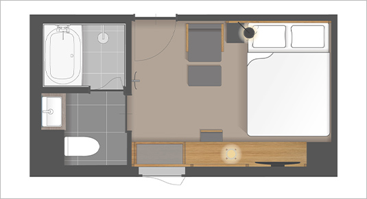 18㎡の客室に幅1,600mmのダブルベッドを配したダブルルームです。オットマン付ソファとブラケットライトでリラックスして本をお楽しみいただけます。洗い場、バスタブ付のバスルームと独立したトイレを備えています。