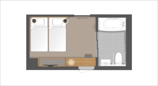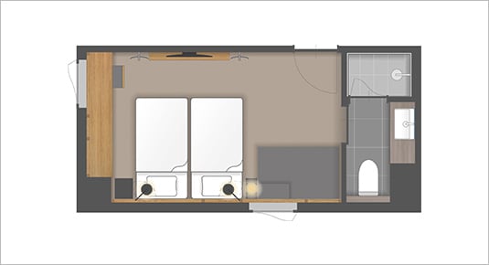 15㎡の客室に幅1,000mmのベッド2台を配したツインルームです。ベッドで本を読んでいただけるようにブラケットライトを用意しております。洗い場、バスタブ付のバスルームと独立したトイレを備えています。