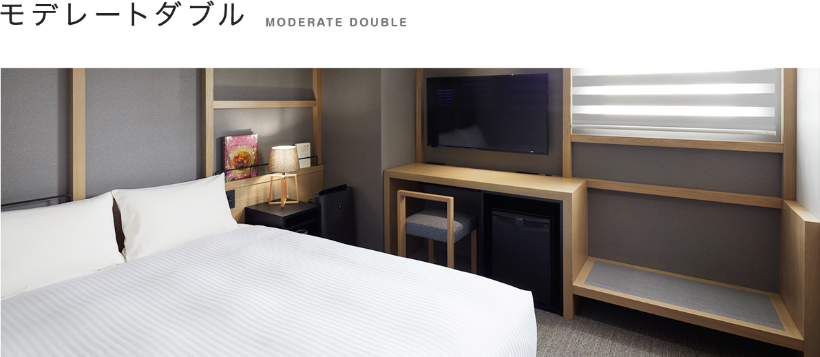 客室は14㎡、ベッドは幅1,500mmと、少し空間にゆとりを持たせたダブルルームです。手荷物が多いお客様でも快適にお過ごしいただけます。オーバーヘッドシャワー付のシャワーブース、独立したトイレ、洗面台を備えています。