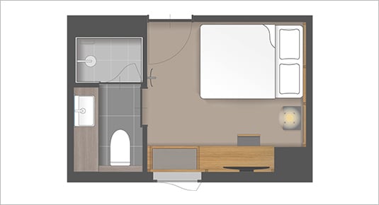 12㎡ながら、幅1,400mmのダブルベッド、オーバーヘッドシャワー付のシャワーブース、独立したトイレ、使い勝手の良い洗面台を機能的に配した客室です。