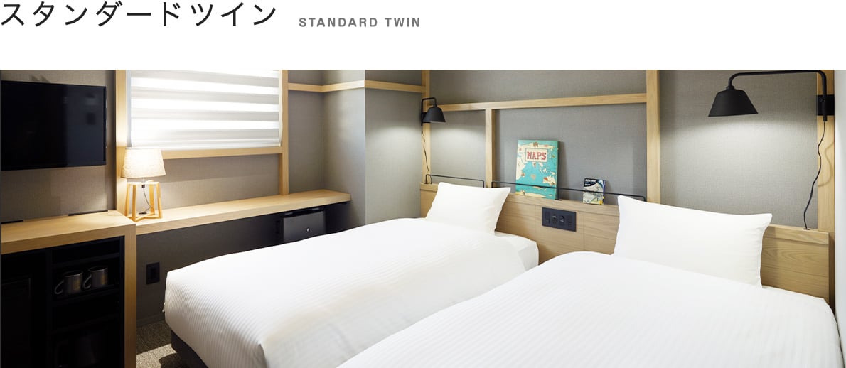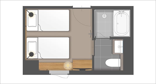 15㎡の客室に幅1,000mmのベッド2台を配したツインルームです。ベッドで本を読んでいただけるようにブラケットライトを用意しております。洗い場、バスタブ付のバスルームと独立したトイレを備えています。