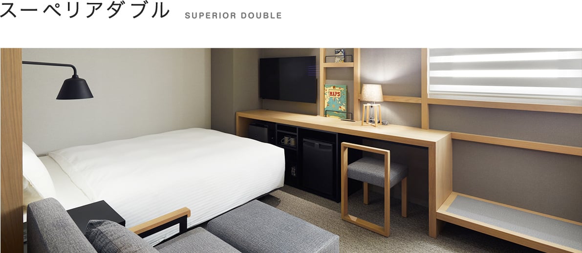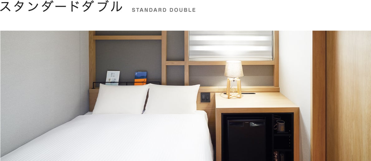 客室は14㎡、ベッドは幅1,500mmと、少し空間にゆとりを持たせたダブルルームです。手荷物が多いお客様でも快適にお過ごしいただけます。オーバーヘッドシャワー付のシャワーブース、独立したトイレ、洗面台を備えています。