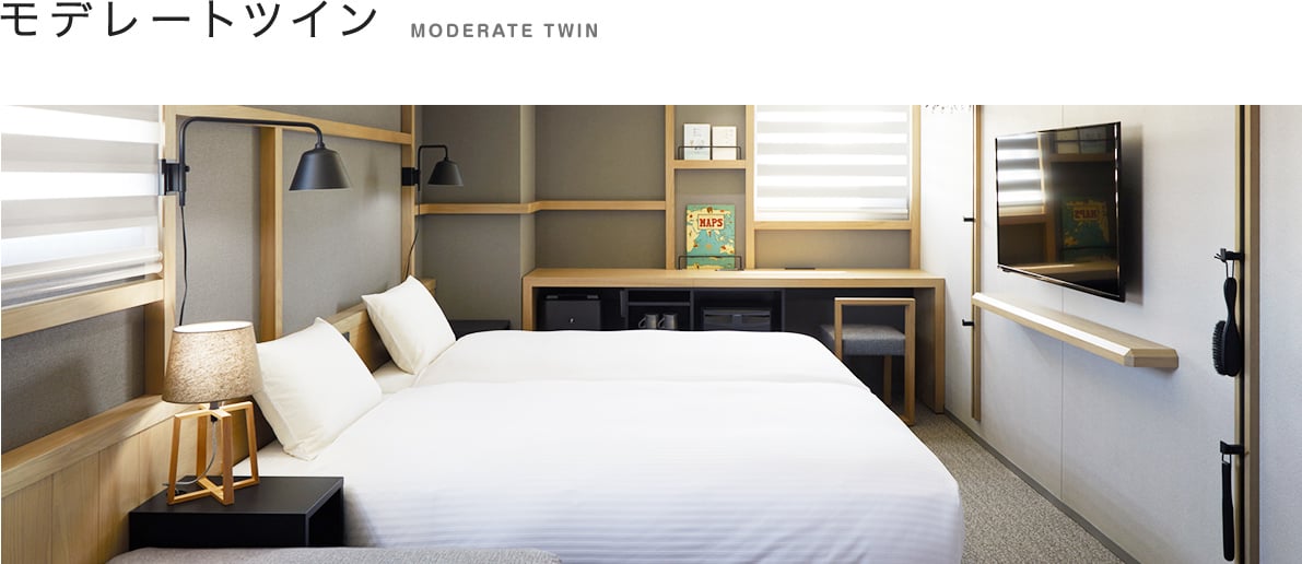 19㎡の客室に幅1,000のベッドが2台のツインルームです。車椅子でのご利用にも対応しております。3点式のユニットバスを備えております。