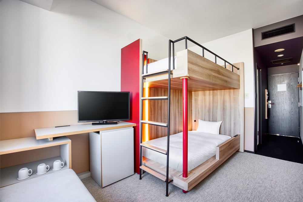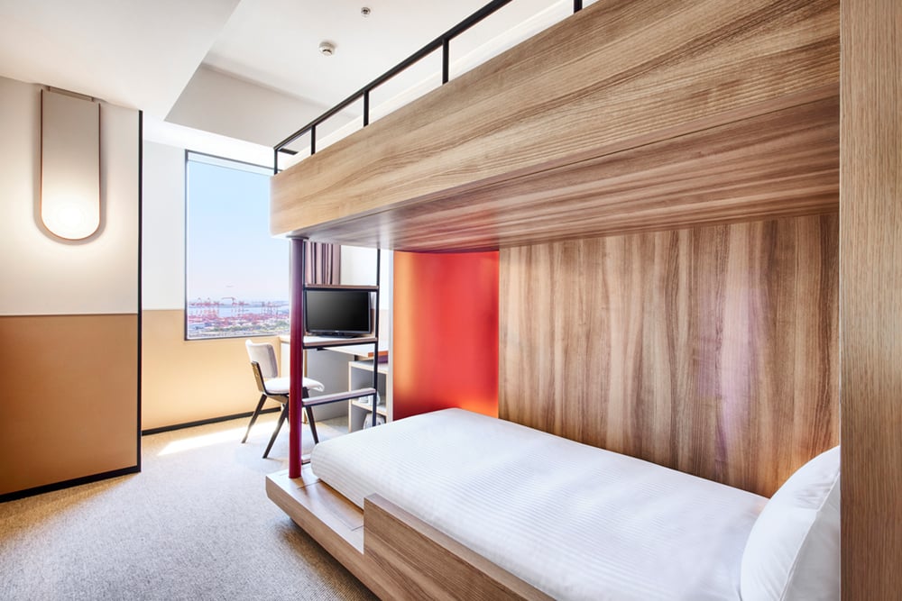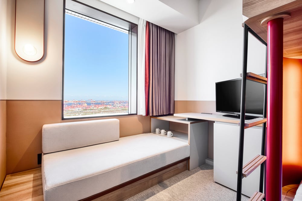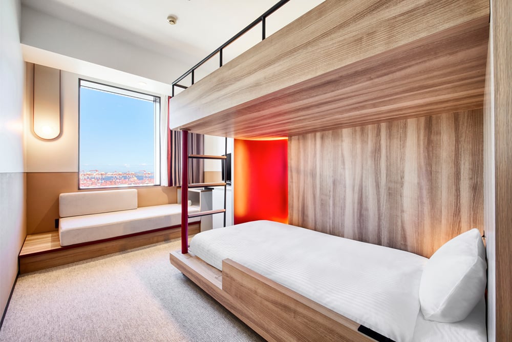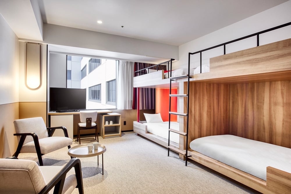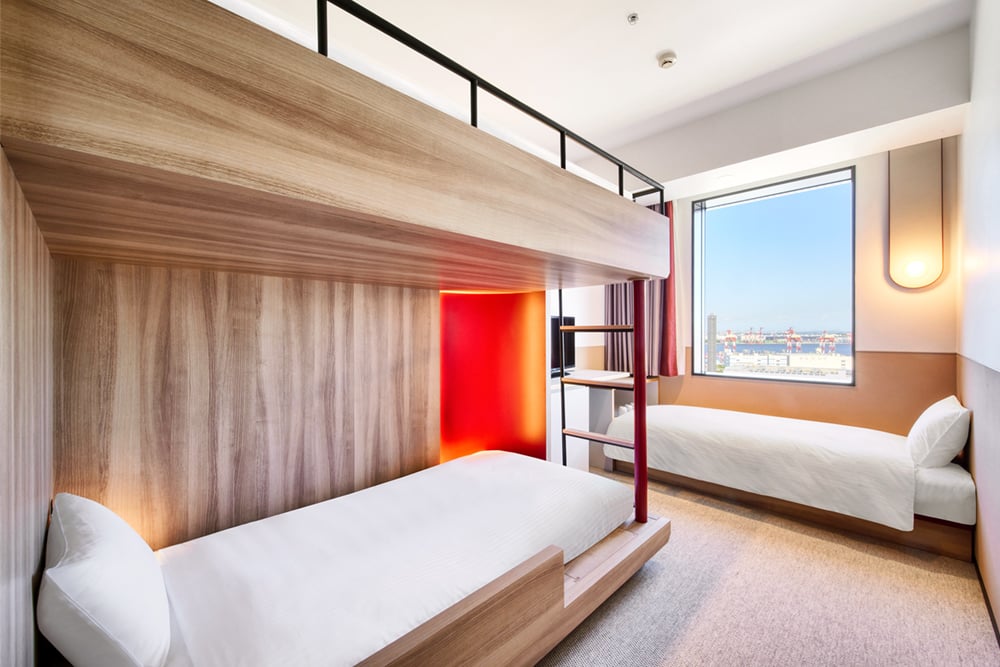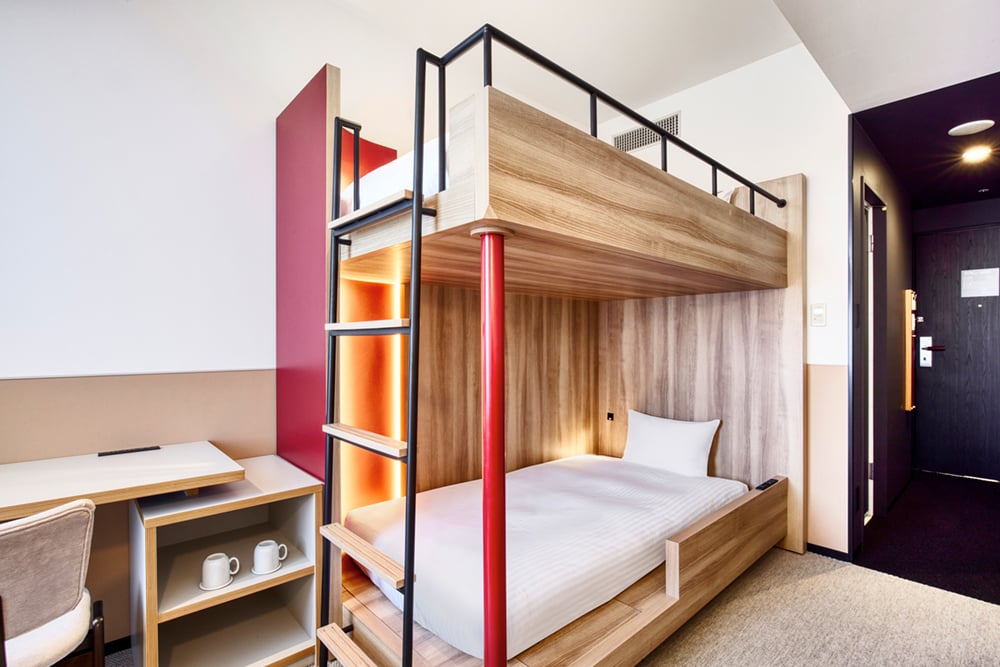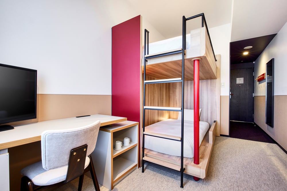 【リニューアル】2段ベッドとソファを備えた機能的な客室です。ソファをベッドとして利用し、最大3名様の宿泊が可能です。