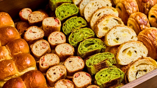 その場で炙っていただく有明産の海苔や焼き魚、地元産のハムやソーセージ、シェフ特製のお漬物など、朝から幸せな気分になれるラインナップをお楽しみください。